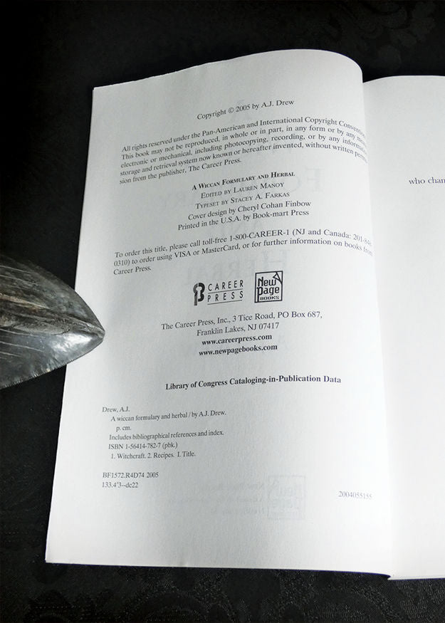 Must have book for every magical library, chock full of herbal facts and wisdom. This book is in wonderful previously loved condition, with minor cosmetic damage here and there but no rips, tears, stains, underlining, highlighting or funny smells. With A Wiccan Formulary and Herbal, A.J. Drew has written an incredibly detailed and informative learning tool for novice herbalists.