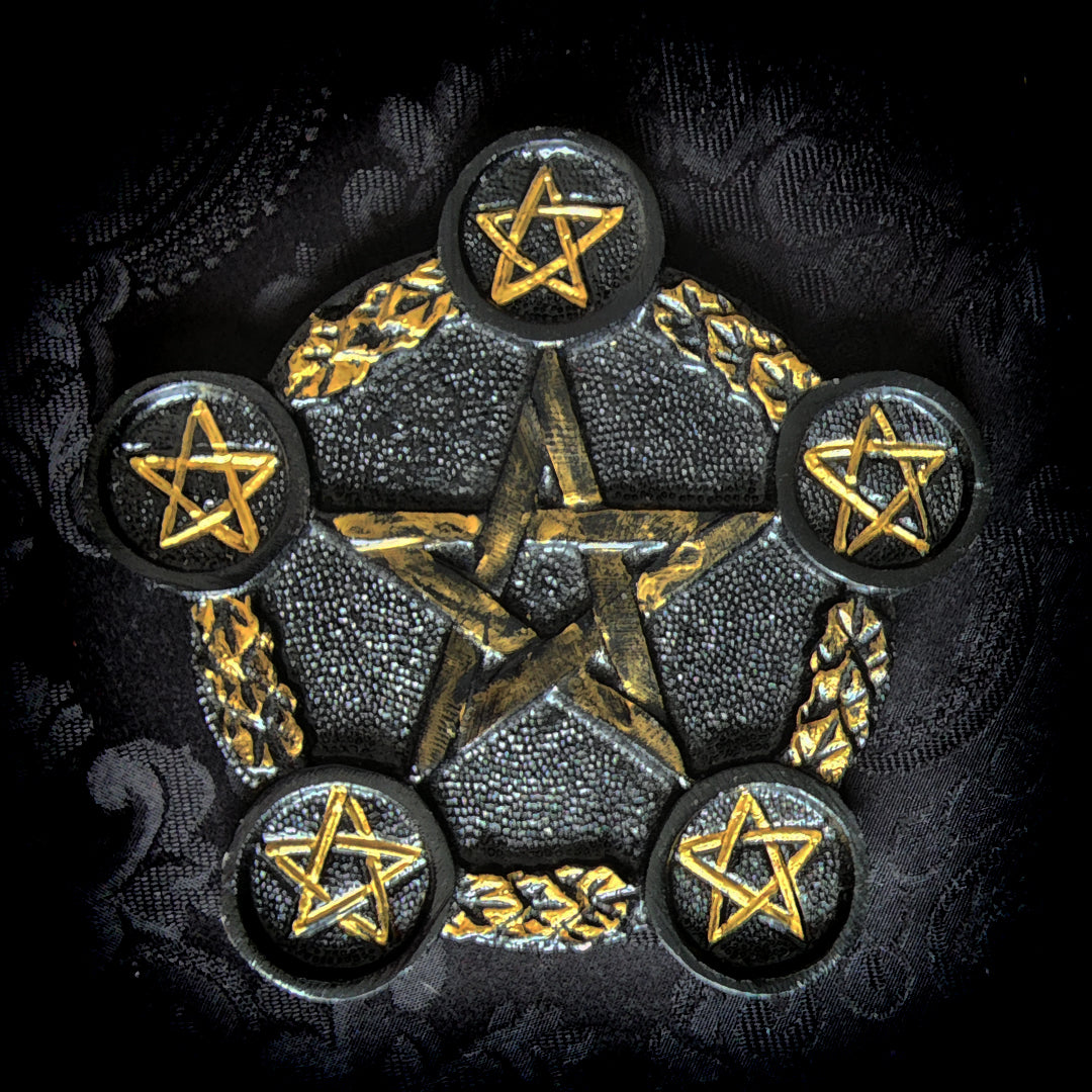 This gorgeous tea light holder is solid, sturdy, and super beautiful. Made of heavy molded resin, there are 5 circular spots for holding tea lights which each have a small star, surrounding a golden Pentagram in the center. A decorative border of golden leaves swirls between each of the candle holding spots and the entire tile is approximately 8 inches across. Perfect for that witch or wizard on your Yule gift list!