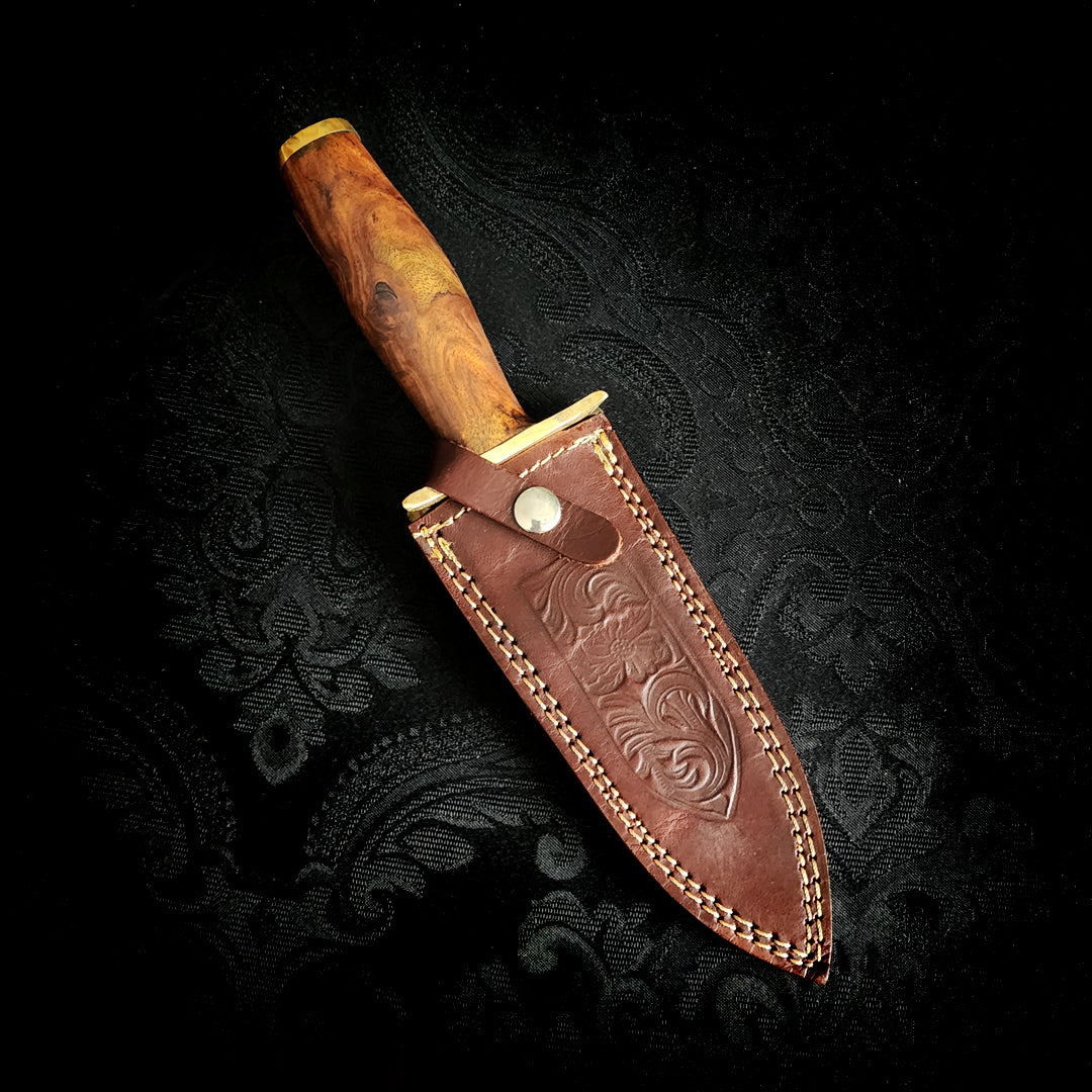 Hand forged by the incredibly talented Rody Stan, this beautiful Athame is a powerful ritual tool as well as a functional (and incredibly sharp!) dagger in it's own right. Constructed from gorgeous Rosewood, Damascus steel and elegantly sculpted brass. Along with the Athame itself is a hand tooled and sewn thick leather sheath with embossed pattern, strong stiching, belt loop and snap closure that securely holds the dagger in place when not in use.