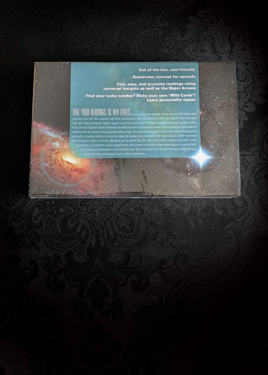 Take your readings to new levels by exploring the depths of the infinite self while also reaching out into the cosmos with this revolutionary 66-card Tarot set with two brand-new concepts that will make divination faster, easier, and more accurate for beginners and advanced readers alike. First, 22 new Spread Cards eliminate the need to learn cumbersome pattern arrangements and instantly address the top issues facing people today. Next, 22 channeled Insight Cards invite you to look outside yourself, providing advice on how to make life better here on Earth. The remaining 22 cards represent the traditional Major Arcana, allowing you to delve into the self and provide answers to life's trickier questions, A companion guide explains the new system and offers alternative ways to use the deck, including as a meditation or clarification tool. Also included is a full-sized reference card with tips, keywords, and astrological definitions. This innovative deck is new and still factory sealed.