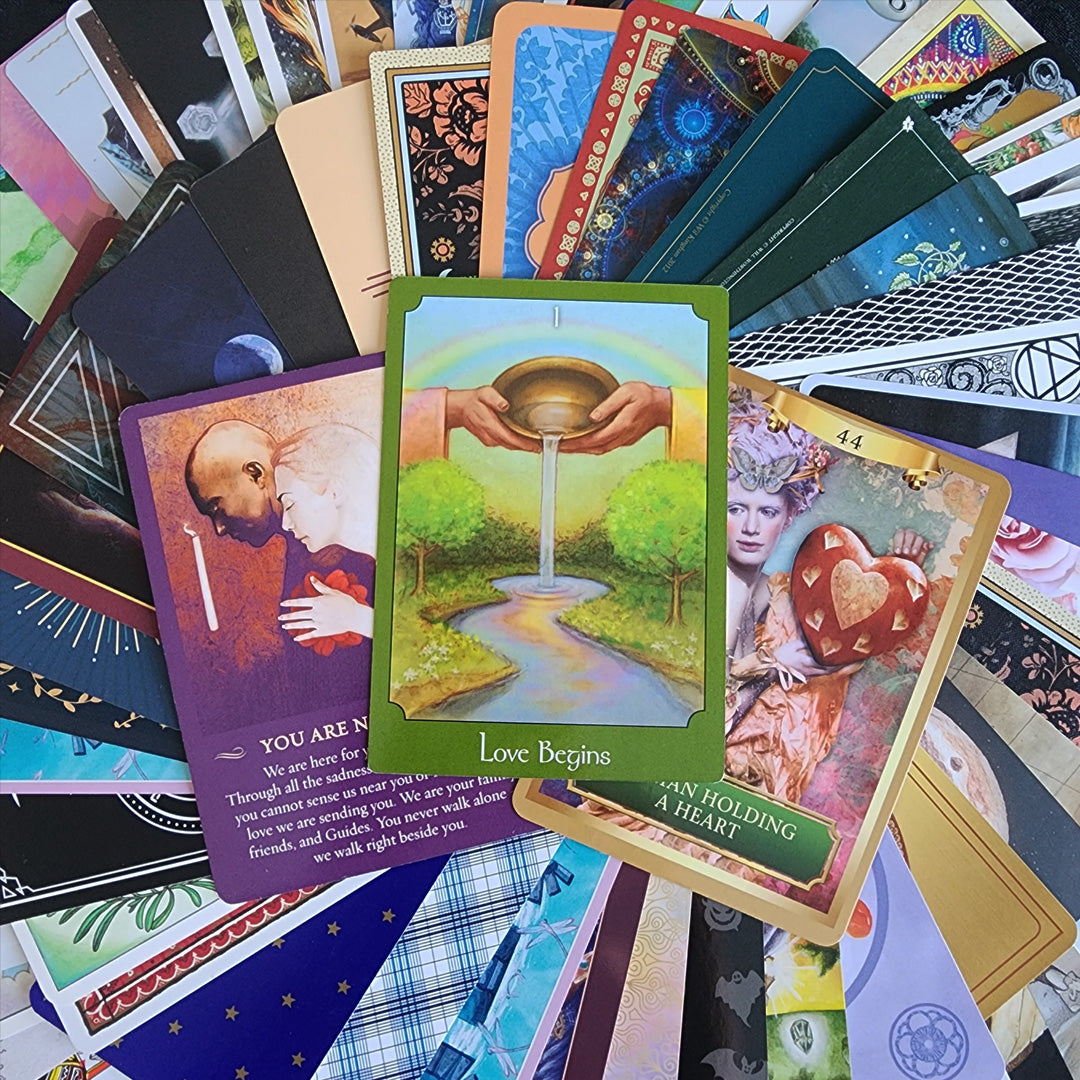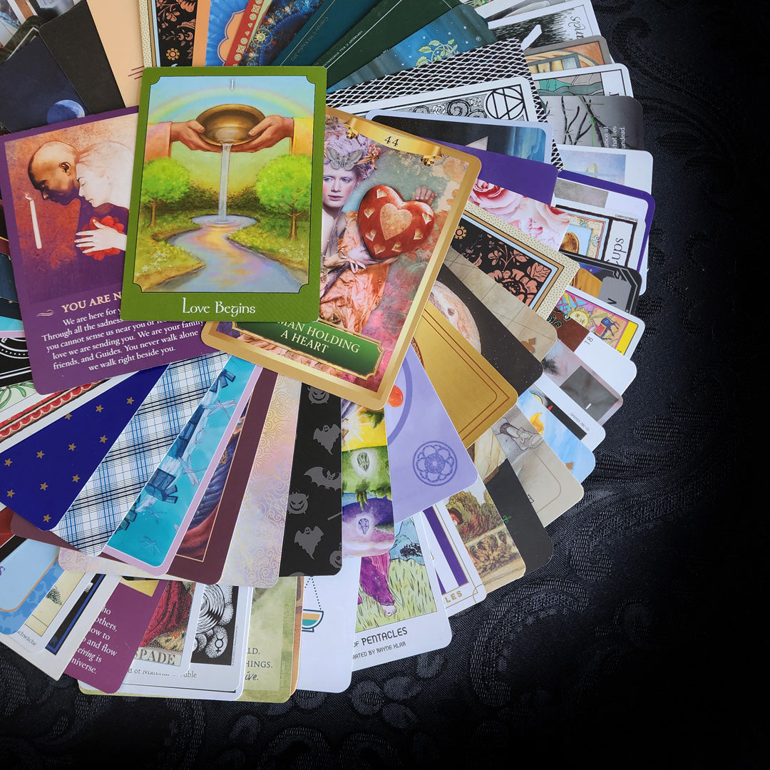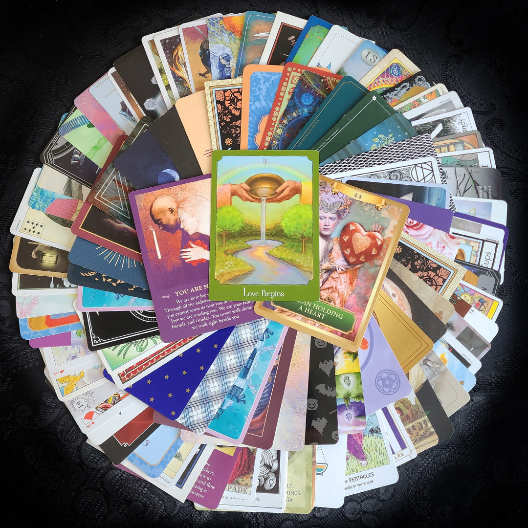This incredible collection of 100 randomly selected Tarot and Oracle Cards comes in a soft, stretchy Green velvet bag. These cards are from all sorts of decks, some gently used, some brand new, some rare, and some regular. All cards are in good condition and the storage bag is brand new. What you see in the pictures is the exact collection that you will receive - gift-wrapped as always!