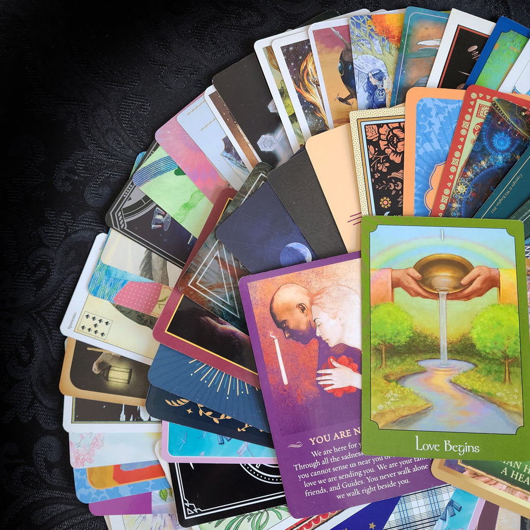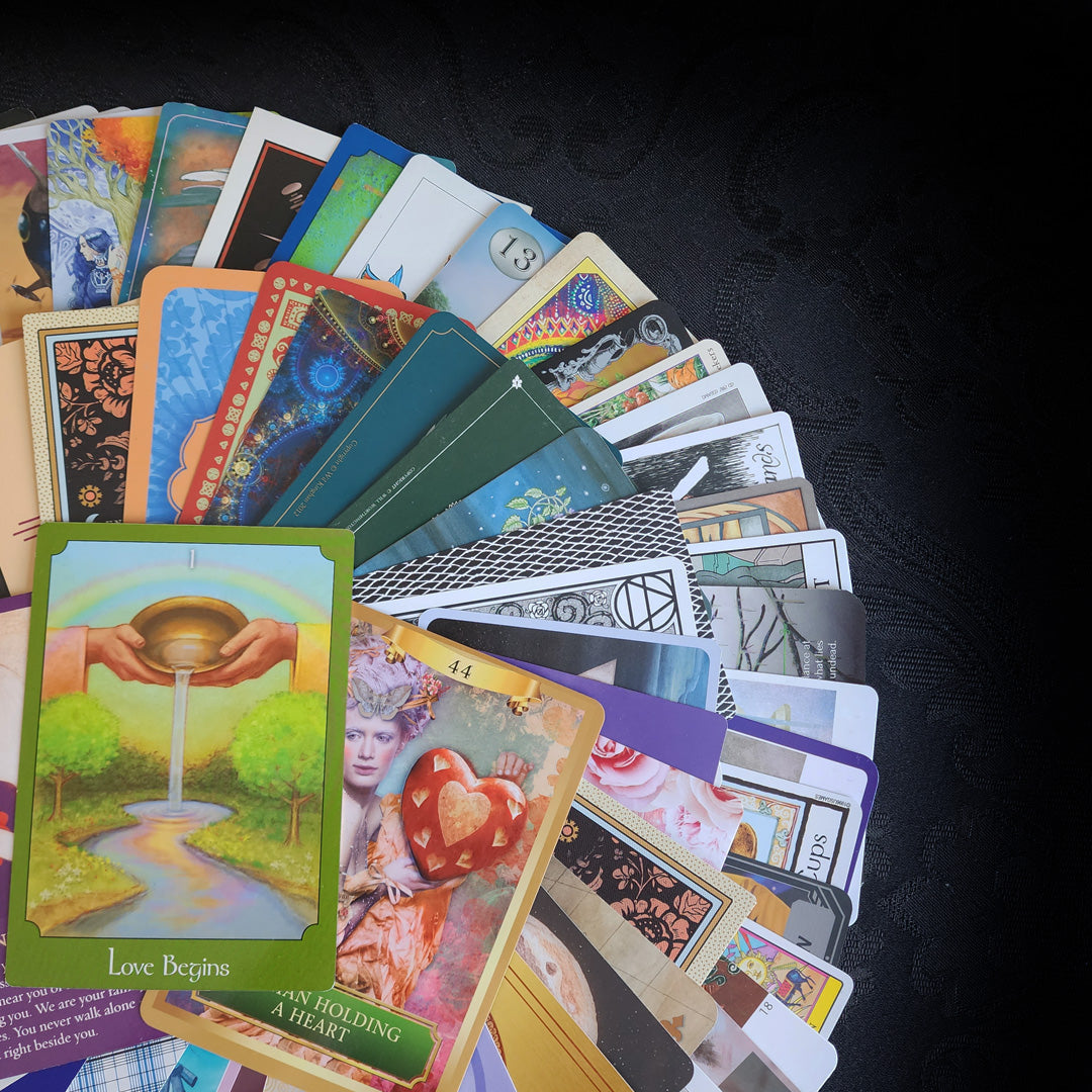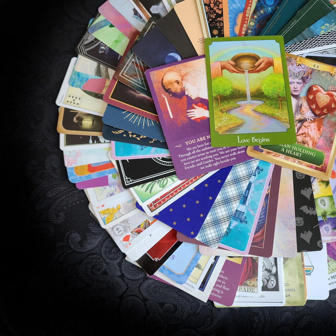 This incredible collection of 100 randomly selected Tarot and Oracle Cards comes in a soft, stretchy Green velvet bag. These cards are from all sorts of decks, some gently used, some brand new, some rare, and some regular. All cards are in good condition and the storage bag is brand new. What you see in the pictures is the exact collection that you will receive - gift-wrapped as always!