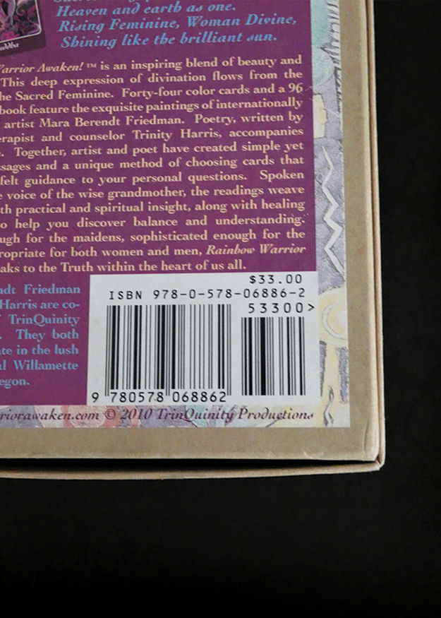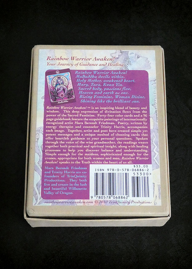 Rainbow Warrior Awaken! is an inspiring blend of beauty and wisdom. This deep expression of divination flows from the power of the Sacred Feminine. Forty-four color cards and a 96-page guidebook feature the exquisite paintings of internationally recognized artist Mara Berendt Friedman. Poetry, written by energy therapist and counselor Trinity Harris, accompanies each image. Together, artist and poet have created simple yet potent messages and a unique method of choosing cards that offer heartfelt guidance to your personal questions. Spoken through the voice of the wise grandmother, the readings weave together both practical and spiritual insight, along with healing processes to help you discover balance and understanding. Simple enough for the maidens, sophisticated enough for the crones, appropriate for both women and men, Rainbow Warrior Awaken! speaks to the Truth within the heart of us all. This wonderful box set includes the complete deck in very fine condition, a deck box in good condition with minor cosmetic wear, and a guidebook in very fine condition that is signed and inscribed by both the artist and the poet.