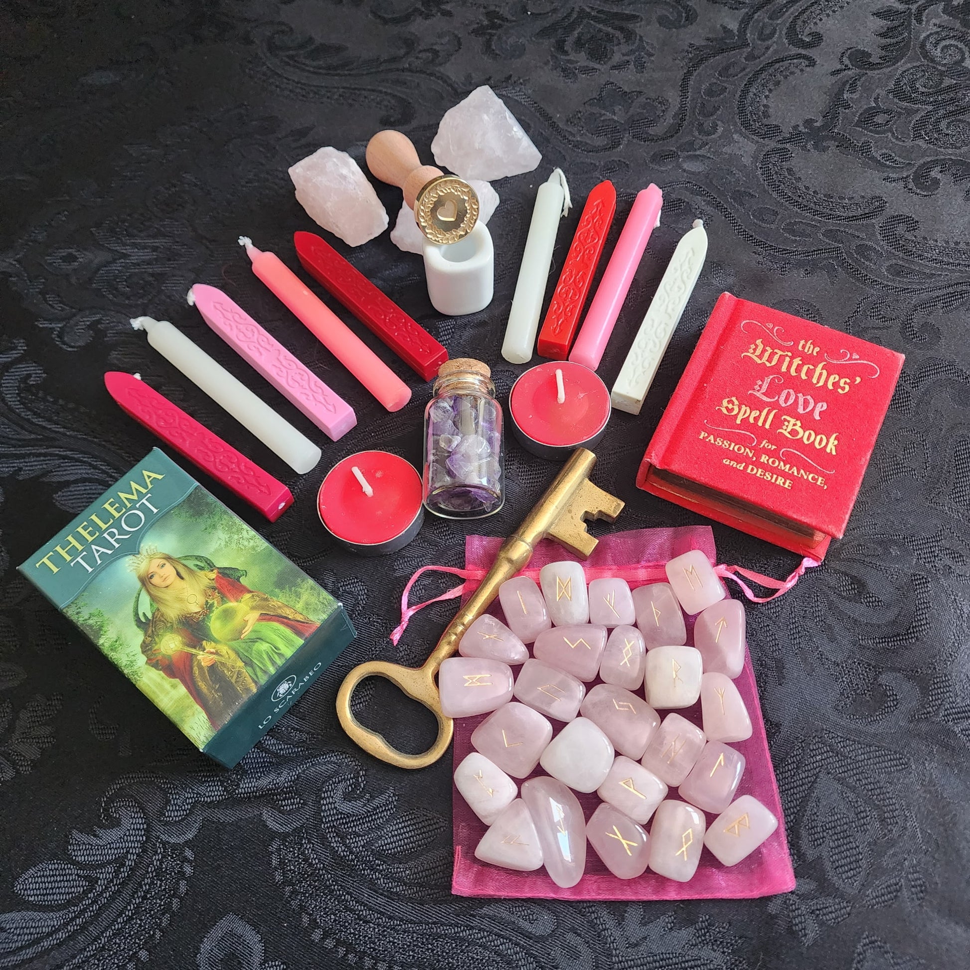 A passion-rooted love and attraction ritual box grounded in heart energy, devotion magic, and sealed intentions. This set blends fire (red candles), earth (rose quartz and amethyst), and sacred symbolism (key and heart seal) for powerful love workings.