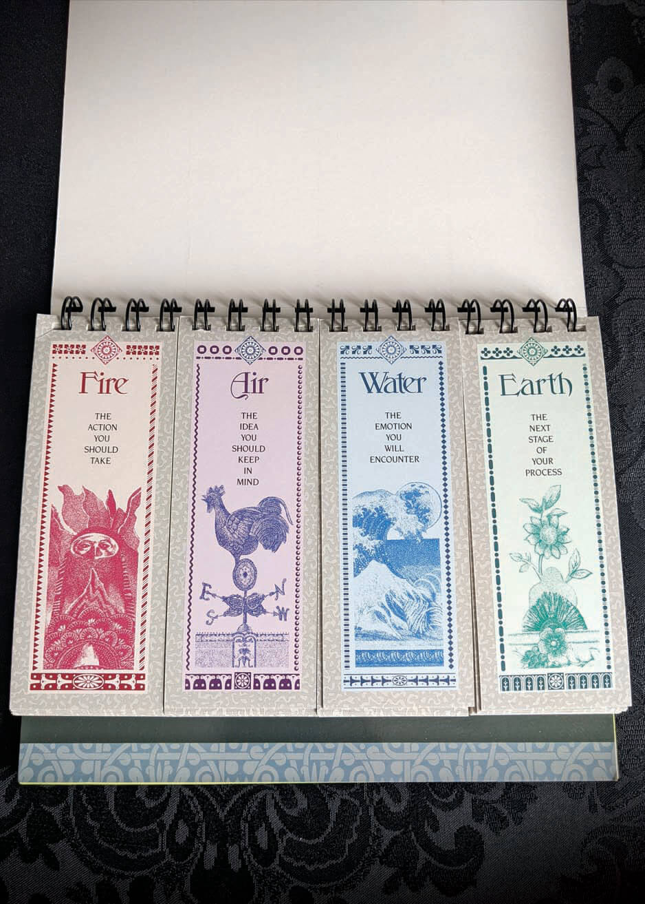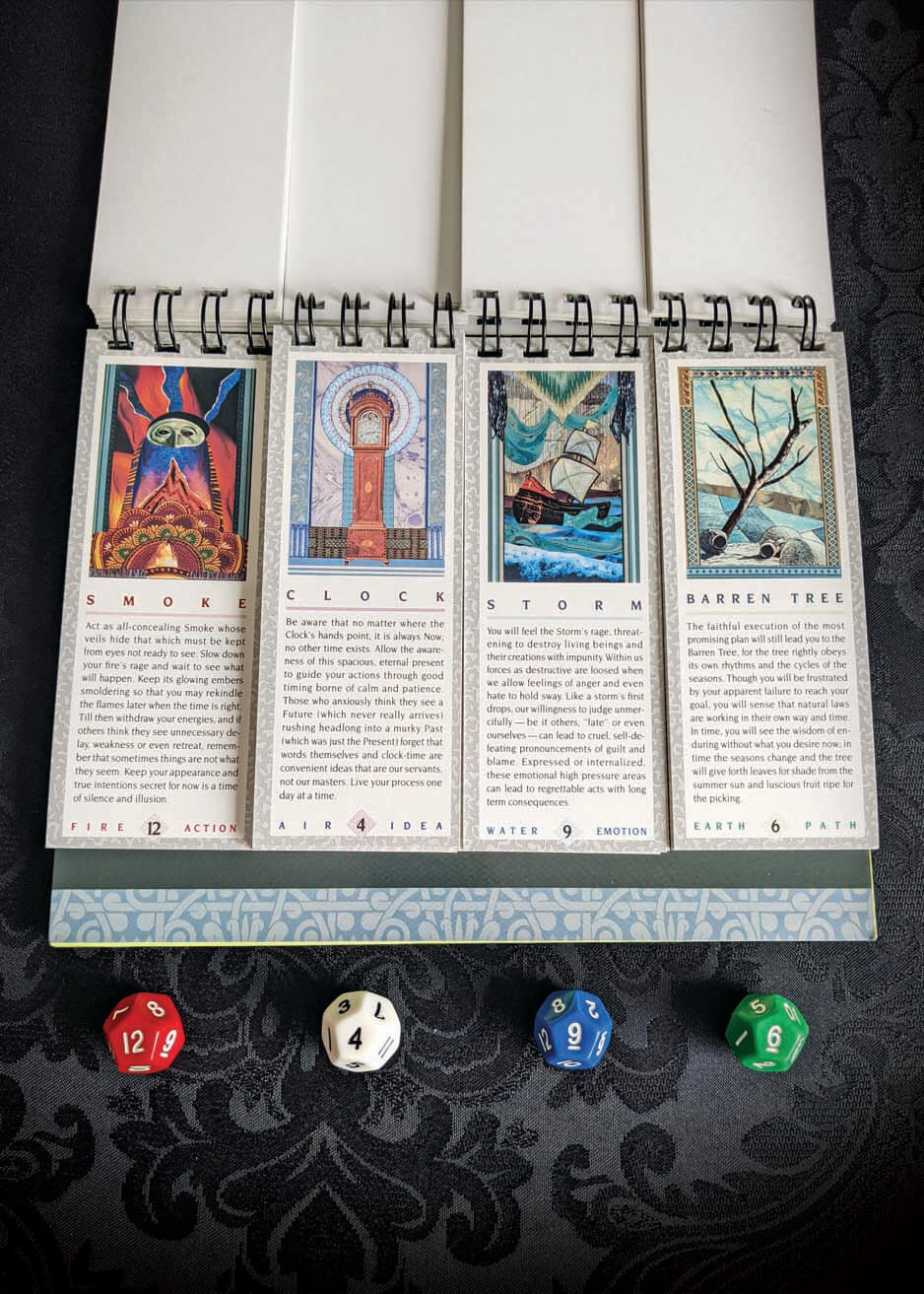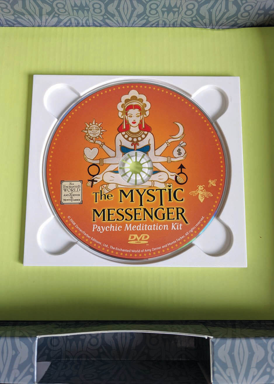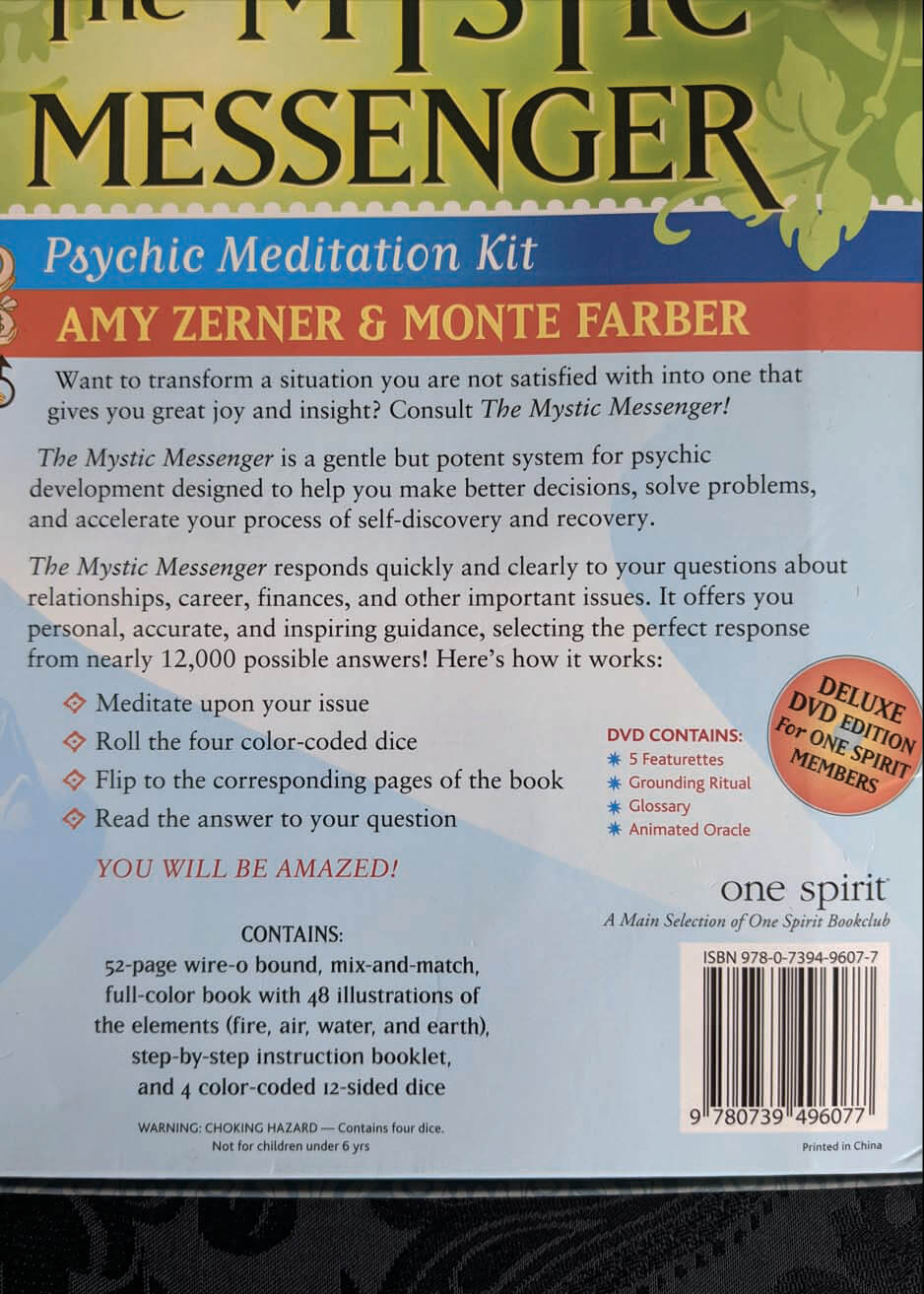 Want to transform a situation you are not satisfied with into one that gives you great joy and insight? Consult the Mystic Messenger! This wonderful kit is a gentle but potent system for psychic development designed to help you make better decisions, solve problems, and accelerate your process of self-discovery and recovery. The Mystic Messenger responds quickly and clearly to your questions about relationships, career, finances, and other important issues. It offers you personal, accurate, and inspiring guidance, selecting the perfect response from nearly 12,000 possible answers! This incredible system includes a 52-page, mix-and-match, full-color book with 48 illustrations of the elements (fire, air, water, and earth) , a step-by-step instruction booklet, and 4 color-coded 12-sided dice. This set is in previously loved, very good condition without any noticeable flaws.