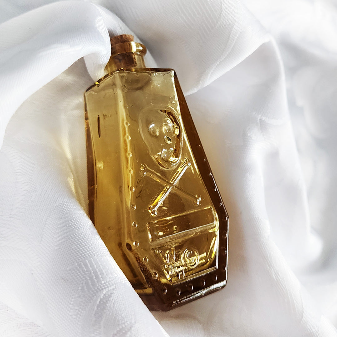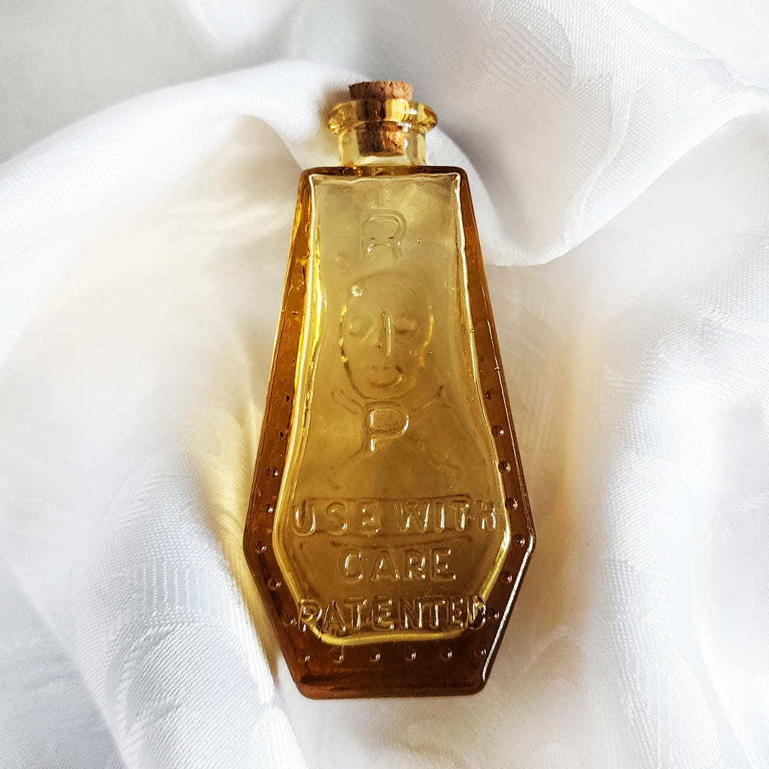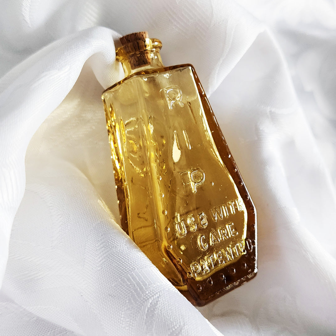 Small yellow glass vintage Poison bottle in the shape of a coffin with the letters R.I.P. on one side and a skull and crossbones on the other. In very fine vintage condition with no imperfections at all, bright color, and a neat, newer looking cork. This extraordinary glass bottle was made by the Wheaton Glass Company in Wheaton N.J. and is not a reproduction.